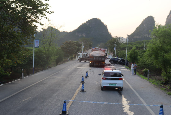 2025年5月3日17时8分许,平乐县公安局交警大队(以下简称平乐交警大队)接到110转警情“在平乐县二塘镇牛角村,一辆重型半挂牵引车与小型普通客车碰撞,有人受伤,报警人已打120”。接到警情后,平乐交警大队立即安排值班民警带领辅警赶赴现场,出警民警到达现场后,被现场执行抢救任务的医务人员告知小型普通客车内1人当场死亡、3人受伤被送往平乐县人民医院救治,出警民警立即将现场情况向大队值班领导及主要领导汇报,接报后,平乐交警大队立即启动应急预案,组织增援警力赶赴事故现场开展现场勘查、秩序维护、调查走访等工作,同时向平乐县公安局主要领导及市公安局交警支队指挥中心汇报有关情况。