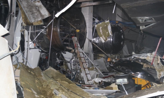 从车间外部视频监控看,爆炸当时车间二楼西北角的窗口有气浪冲出,同时一楼西南角的门有剧烈摇摆晃动现象。从爆炸现场看,彩钢隔板破损,车间门窗玻璃震碎,2#干燥机筒体完好,中间的3个玻璃观察孔有裂纹,两边封头已冲出,进口封头落在离筒体约5米处,出口封头落在离筒体约10米处。干燥机内履带、物料有烧黑、碳化现象,其中第四段加热段及冷却段较为严重。出口封头侧,洁净区的空调出风管弯头断落,现场罐体内有明火燃烧。