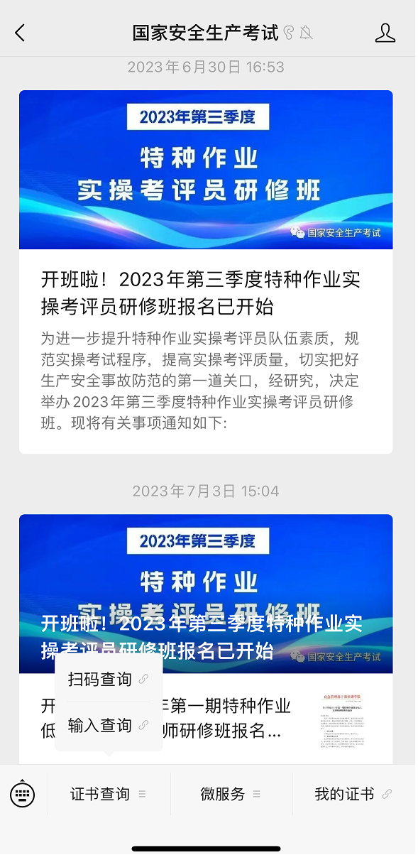 关注公众号“国家安全生产考试”,点击底端“证书查询”然后选择“扫码查询”或“输入查询”进行查询。凡是直接使用微信“扫一扫”扫描证书二维码即可获取证书信息的情况,均为假冒证书。