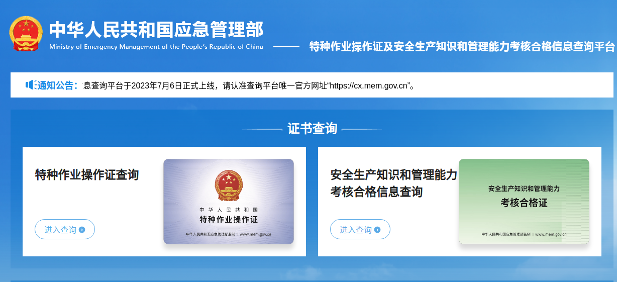 2.“特种作业操作证及安全生产知识和管理能力考核合格信息查询平台”(网址https://cx.mem.gov.cn)